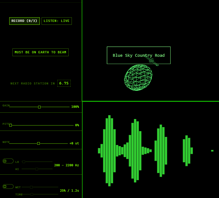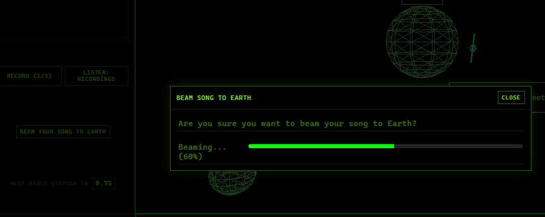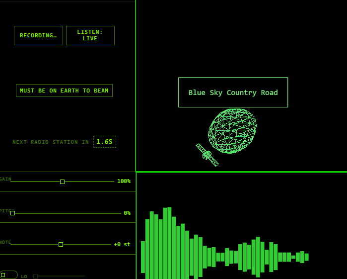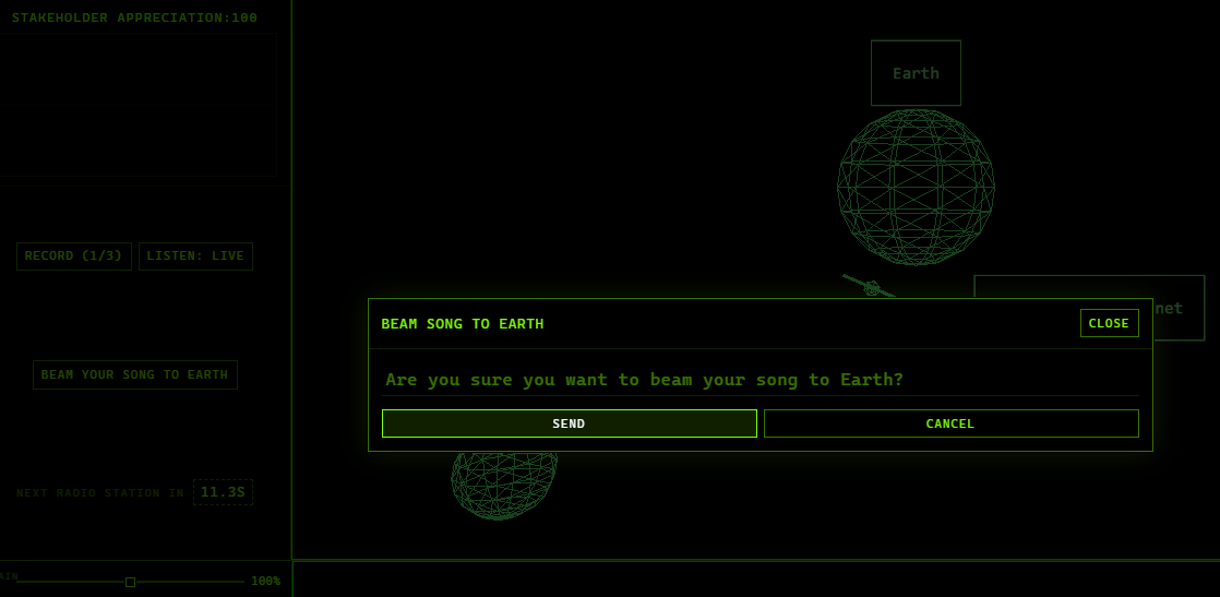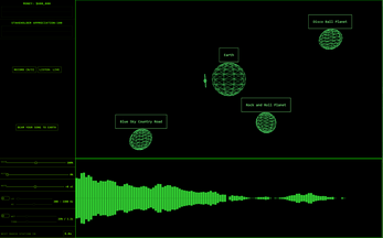 Click on different planets to travel to them. Hit the Record button to save the current sound to your song. After collecting a max of 3 fly back to earth (make sure you have money!) and beam the song back down.